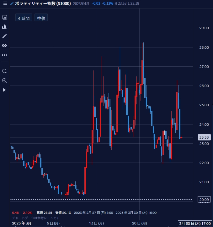 SVBの破綻騒ぎから始まり、現在市場は混乱しています。この短期間にVIXは20~30のレンジで大きく変動して上げ下げを繰り返しています。